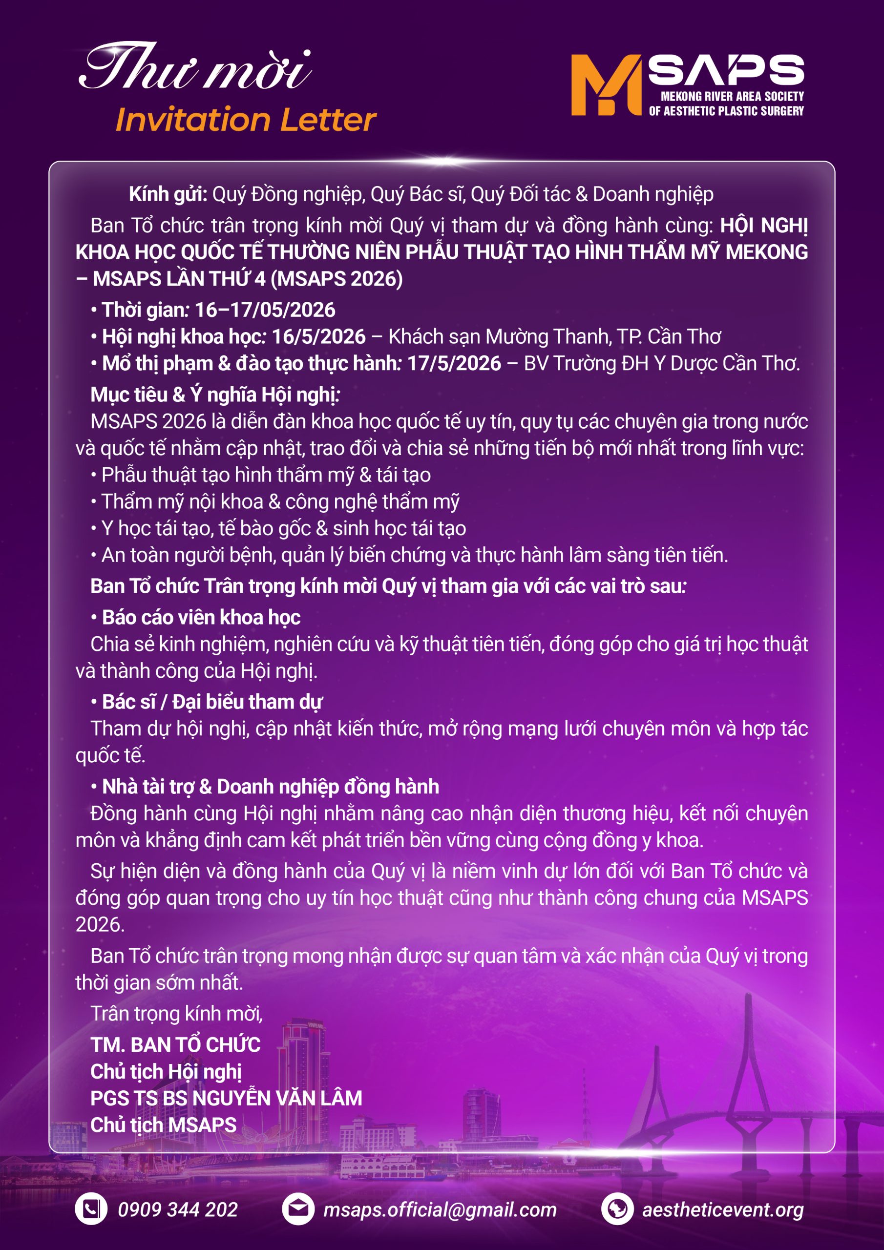 HỘI NGHỊ KHOA HỌC QUỐC TẾ THƯỜNG NIÊN PHẪU THUẬT TẠO HÌNH THẨM MỸ MEKONG LẦN THỨ 4 (MSAPS IV)