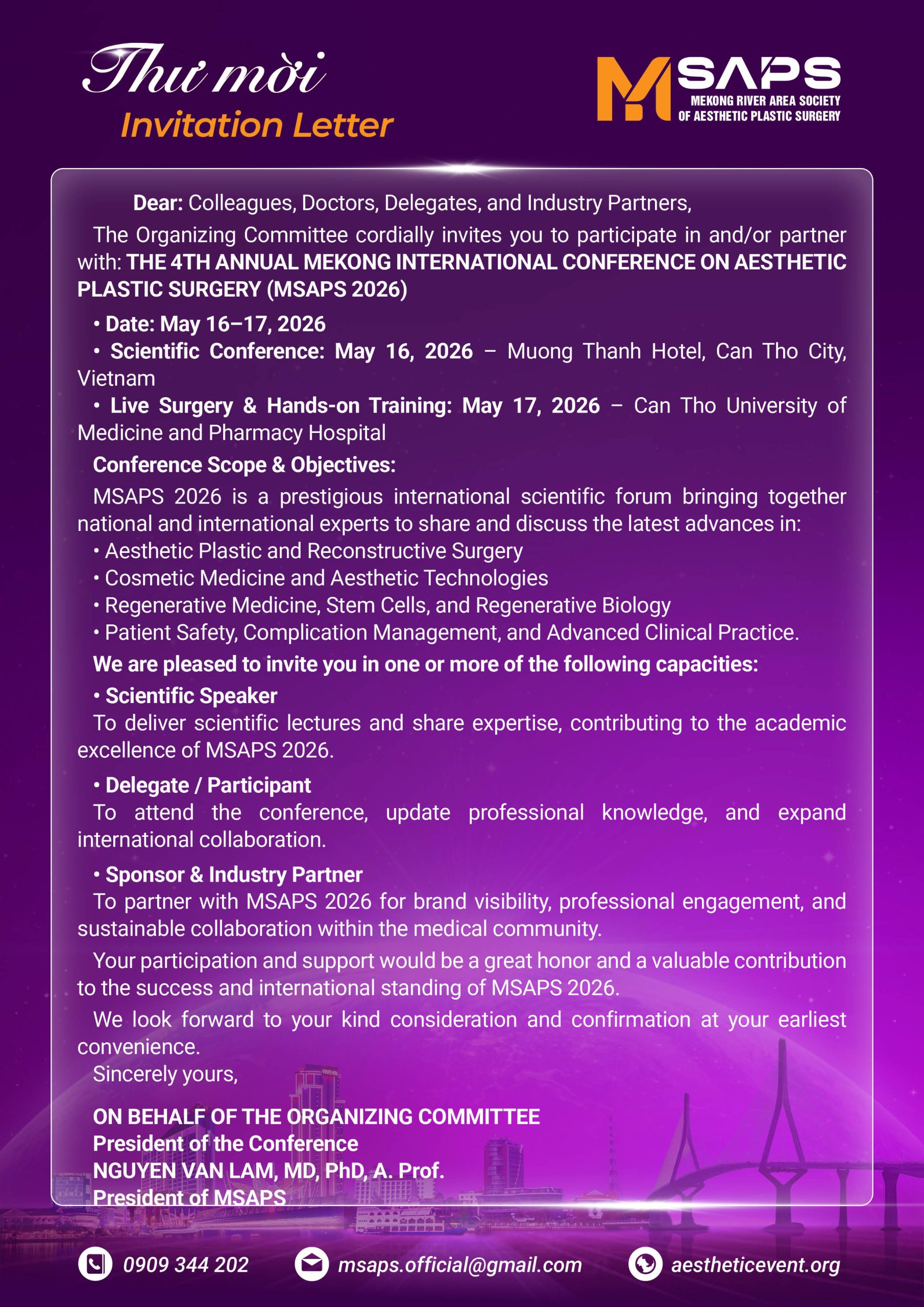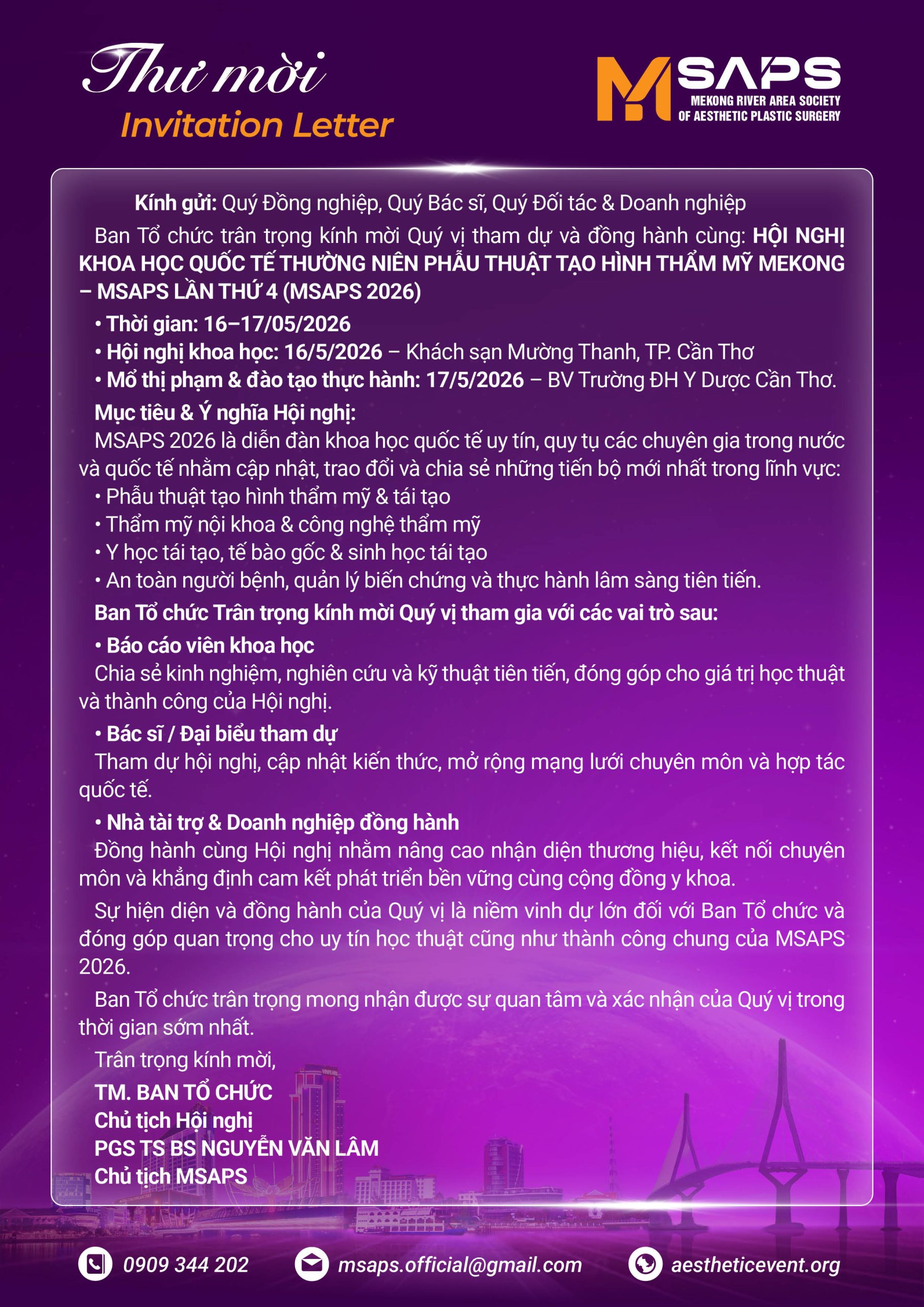 Hội nghị là sự kiện khoa học quốc tế có ý nghĩa đặc biệt, đánh dấu 10 năm hình thành và phát triển của IMAPS, là nơi cập nhật xu hướng, kỹ thuật, bằng chứng khoa học và thực tiễn lâm sàng, quy tụ các chuyên gia đầu ngành trong lĩnh vực phẫu thuật tạo hình thẩm mỹ, thẩm mỹ nội khoa và y học tái tạo – tế bào gốc.